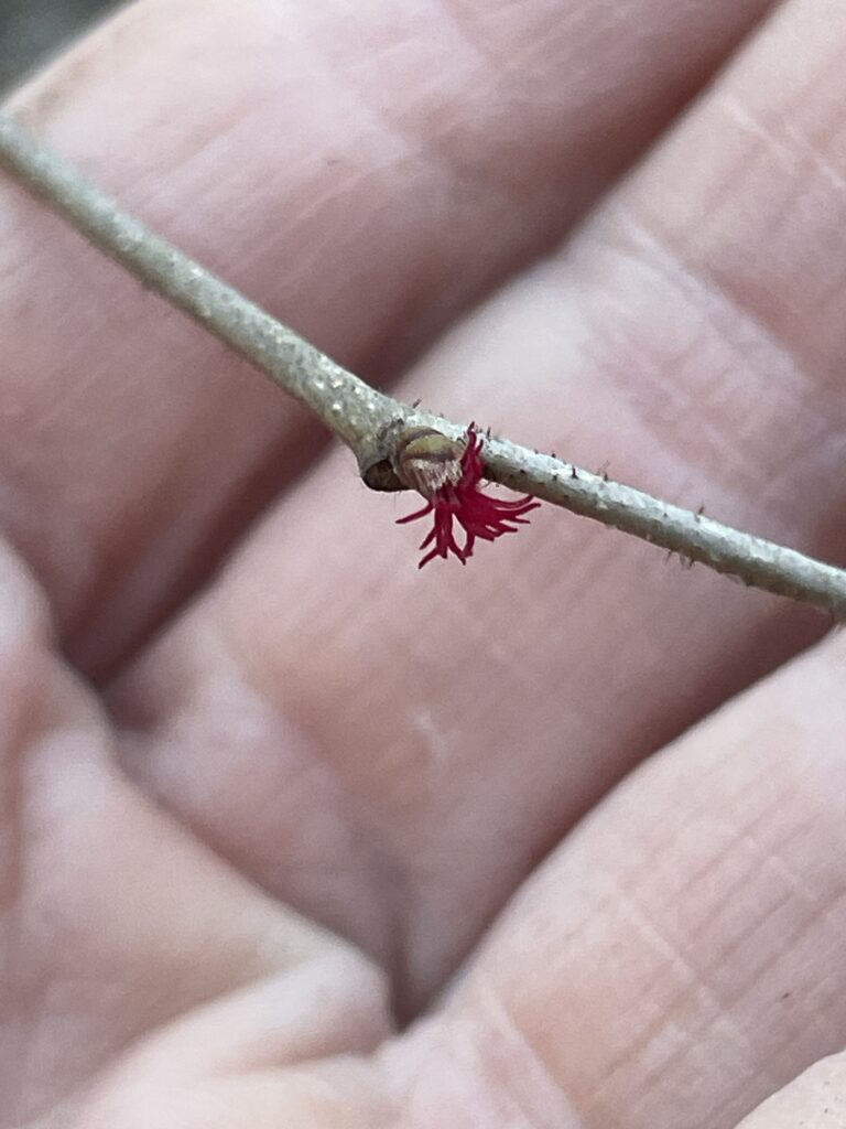 Our lovely Ozark witch hazel has finally started to finish up its long wintertime bloom from January to March. Who’s next? Escorting us into official spring, we have our native prairie willow (Salix humilis) and American hazelnut (Corylus americana) shrubs. Prairie willow is an excellent shrub for pollinators who may be active at this time (flies and maybe even some of our early spring native bees!), and the hazelnut is wind pollinated, so it won’t be waiting around for the pollinators. Hazelnut flowers are a pretty fascinating sight; both male and female flowers are on one plant. The male flowers bloom from the dangling catkin structures, and the female blooms are so tiny, but look like a beautiful magenta spider’s legs. Such a welcome sight as we head out of winter!